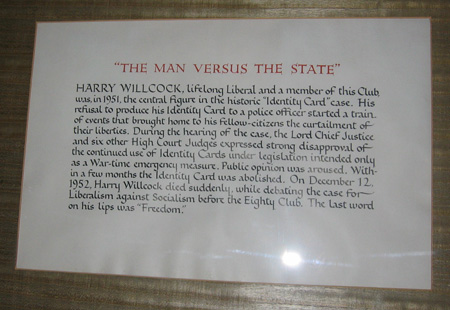 National Liberal Club panel about Harry WillcockHARRY WILLCOCK, lifelong Liberal and a member of this Club, was, in 1951, the central figure in the historic “Identity Card” case. His refusal to produce his Identity Card to a police officer started a train of events that brought home to his fellow-citizens the curtailment their liberties. During the hearing of the case. the Lord Chief Justice and six other High Court Judges expressed strong disapproval of the continued use of Identity Cards under legislation intended only as a War-time emergency measure. Public opinion was aroused. Within a few months the Identity Card was abolished. On December 12, 1952, Harry Willcock died suddenly, while debating the case Liberalism against Socialism before the Eighty Club. The last word on his lips was “Freedom”.