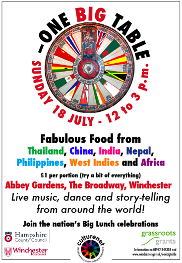 One Big Table is a local version of The Big Lunch. Â One Big Table has the aim of bringing together and celebrating the increasingly diverse cultural communities in Winchester.